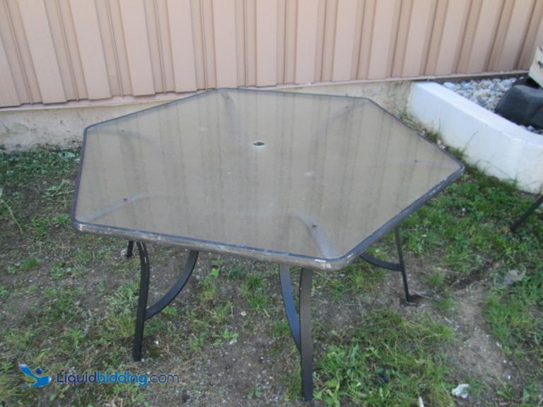 Glass Hexagon Patio Table : 6 patio chairs (2 with arm rests) dark brown no cracks or stain on glass.. Hexagon shaped patio glass table with opening for umbrella. Using a hexagon patio coffee table as a geometric accent on your patio will give the space a sophisticated, designer feel. You can't beat the affordable price of this simple table, which has a tempered glass tabletop and durable metal frame. Hexagon patio dining table shaped outdoor image modern Hexagon patio table replacement glass patios home 3.